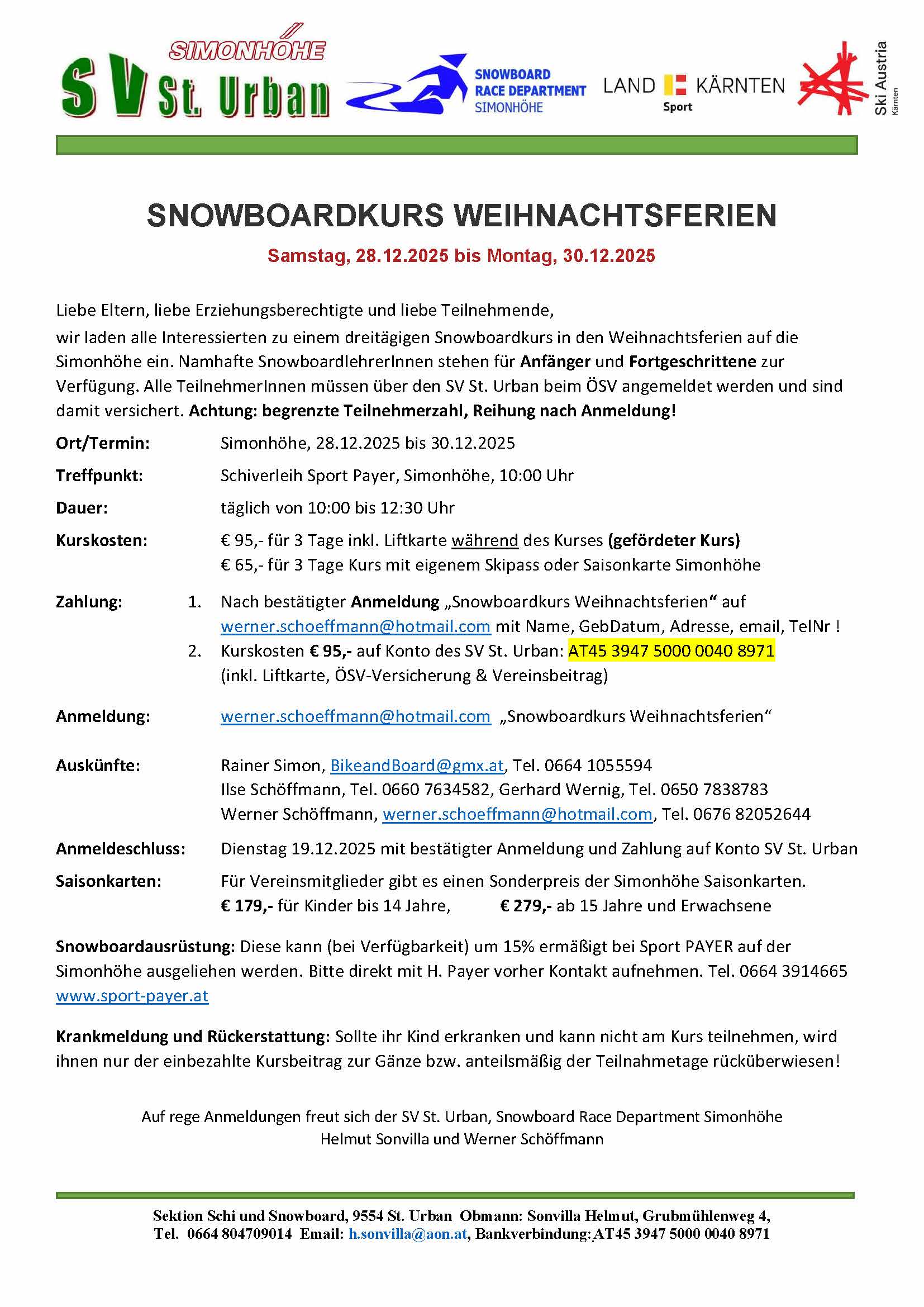 Seit mittlerweile über 5 Jahren kümmert sich das Snowboard Race Department Simonhöhe um alles was mit dem Thema Snowboarden zu tun hat. Vom Anfängerkurs bis zum FIS Weltcuprennen ist hier für jeden was dabei und wir freuen uns über jede/n Boarder/in welche wir auf ihrem persönlichen Weg unterstützen können.